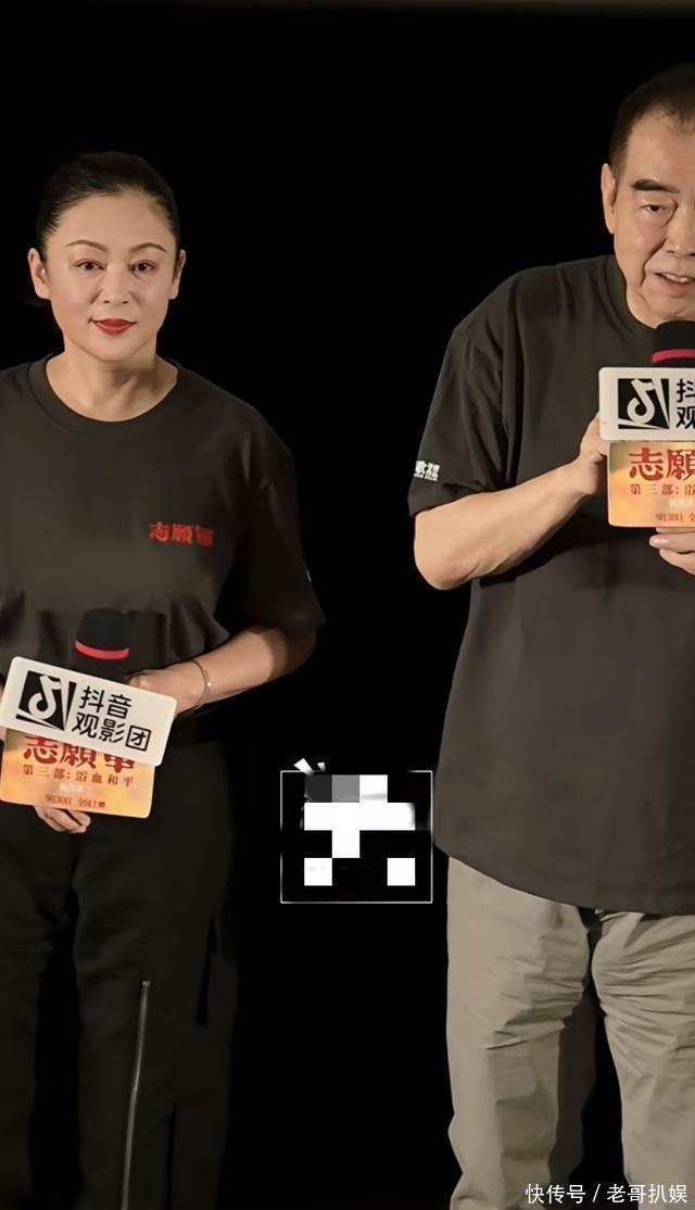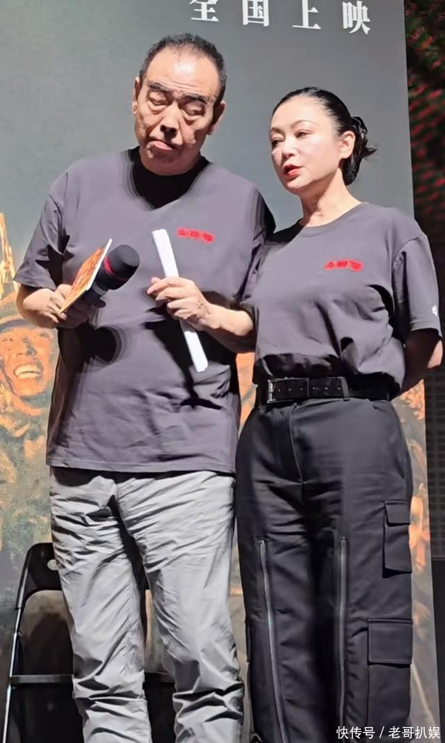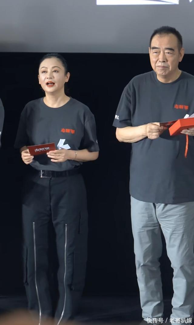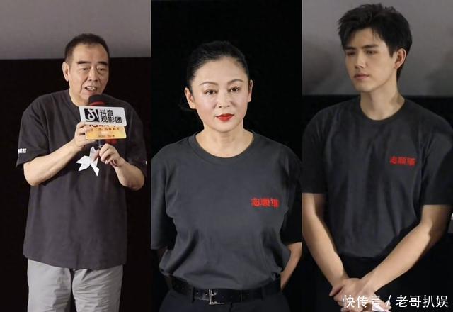 当天,陈红和陈凯歌都穿着电影宣传T恤,夫妻俩并没有和儿子陈飞宇站一块。陈飞宇在另一边和其他几位演员一起,现场表情严肃,状态紧绷,看来爸妈都在场并没有让陈飞宇放松一些。
